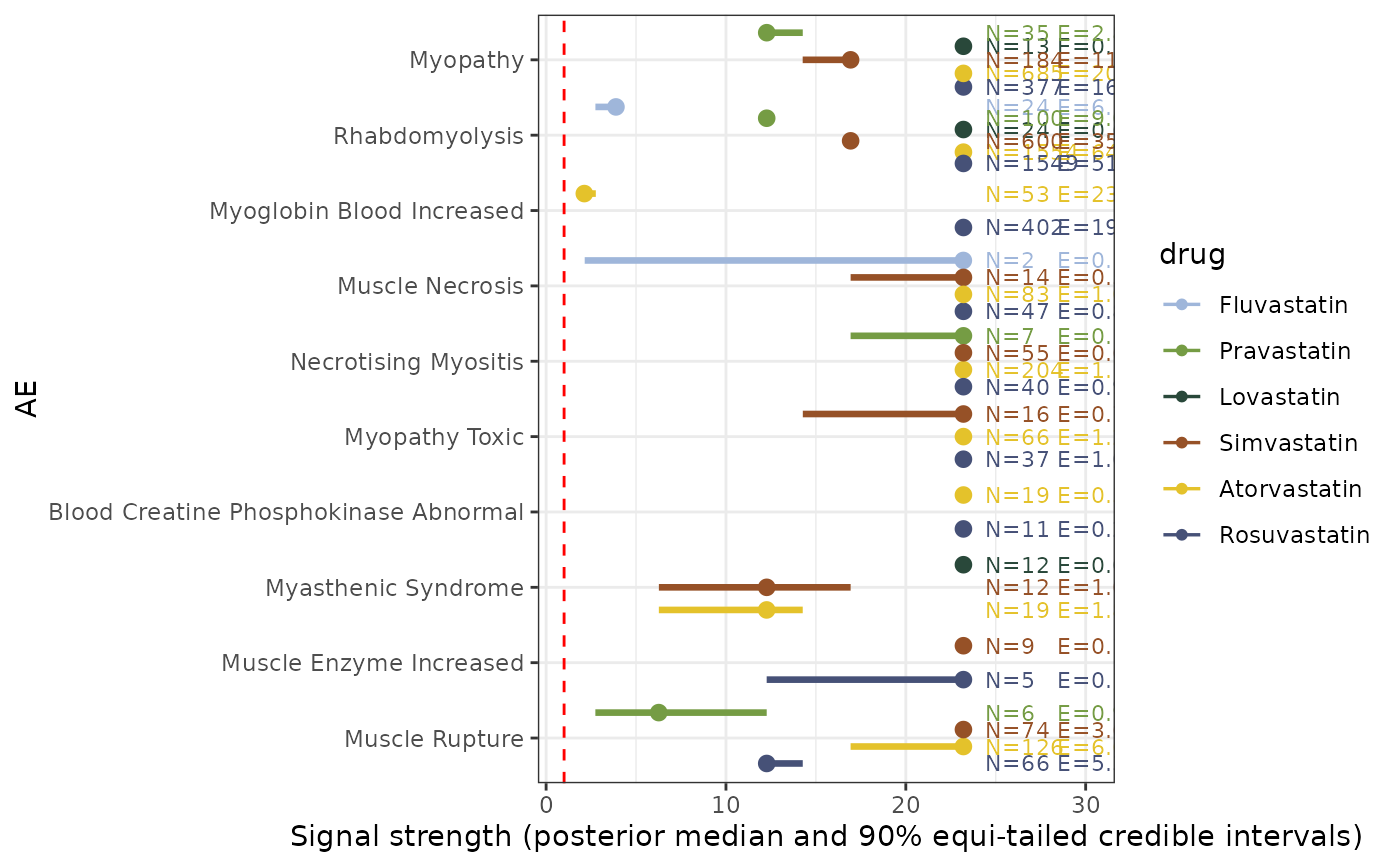 eyeplot_pvEBayes.RdThis function creates an eyeplot to visualize the posterior distributions of \(\lambda_{ij}\) for selected AEs and drugs. The plot displays posterior median, 90 percent credible interval for each selected AE-drug combination.